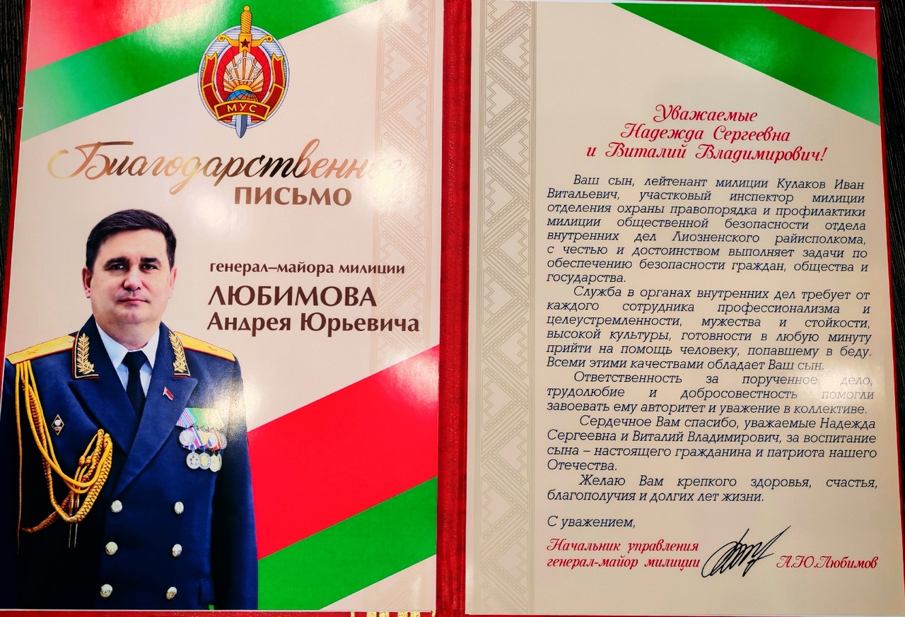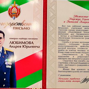 Благодарственное письмо от начальника УВД Витебского облисполкома генерал-майор милиции Любимова А.Ю., за воспитание сына, который с честью и достоинством выполняет задачи по обеспечению безопасности граждан, общества и государства.
