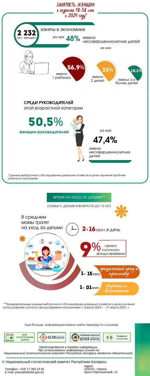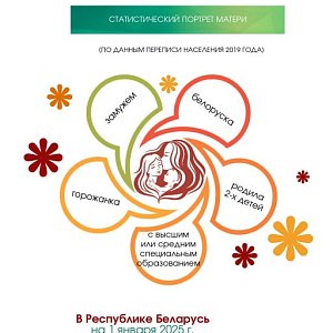 Статистический обзор ко Дню матери (14 октября) В Беларуси на 1 января 2025 г. в возрасте 18 лет и старше проживали 4 047 тыс. женщин из них 55,1%- матери В 2024 году в брак вступили 46 242 женщины Средний возраст вступления в брак: первый- 26,7 года повторный- 40,3 года Средний возраст матери при рождении ребенка - 27,6 лет ЗАНЯТОСТЬ ЖЕНЩИН в возрасте 18-58 лет в 2024 году - 2 232 тыс. женщин из них 48% имели несовершеннолетних детей · 56,9% имели 1 ребенка · 33% имели 2 детей · 10,1% имели 3 и более детей