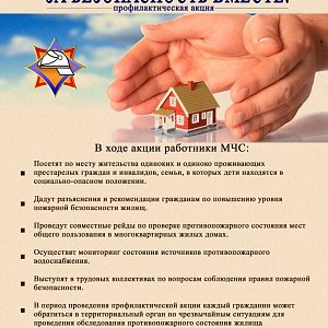 Республиканская профилактическая акция проводится в период с 25 по 2 ноября. В рамках профилактических мероприятий представители МЧС, органов внутренних дел, труда и социальной защиты, образования, жилищно-коммунального хозяйства, здравоохранения и энергетики будут проводить обследования жилых помещений граждан для выявления и оказания помощи в устранении факторов, влияющих на безопасность жизнедеятельности.